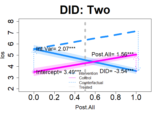 plot(dm1, "DID", add.legend="bottom", xlim=c(-.1, 1.1), ylim=c(2, 8), main="DID: Two", col=c("dodgerblue","magenta"), lwd=7, cex=2, cex.axis=2, cex.lab=1.5,  cex.main=3, arrow=TRUE, xshift=c(.02), cex.text=1.5, coefs=TRUE, round.c=2, cfact=T, conf.int=TRUE, adj.alpha=0.2 )