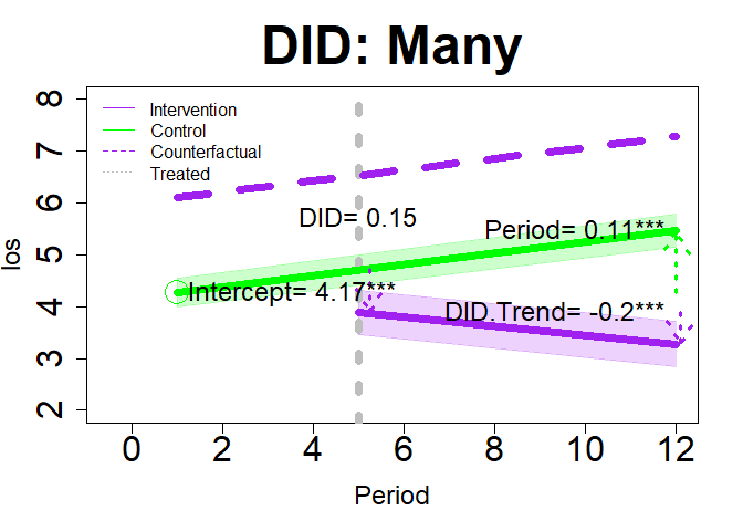 plot(dm2, "DID", add.legend="topleft", xlim=c(-.5, 12), ylim=c(2, 8), main="DID: Many", col=c("purple","green"), lwd=7, cex=3, cex.axis=2, cex.lab=1.5,  cex.main=3, arrow=TRUE, xshift=c(.25, .1), cex.text=1.5, coefs=TRUE, round.c=2, cfact=T, conf.int=TRUE, adj.alpha=0.2 )