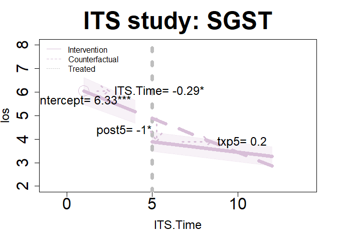plot(im11, "ITS", add.legend="topleft", xlim=c(-1, 14), ylim=c(2, 8), main="ITS study: SGST", col="thistle", lwd=7, cex=3, cex.axis=2, cex.lab=1.5,  cex.main=3, arrow=TRUE, xshift=c(.25, .25), cex.text=1.5, coefs=TRUE, round.c=2, cfact=T, conf.int=TRUE, adj.alpha=0.2 )