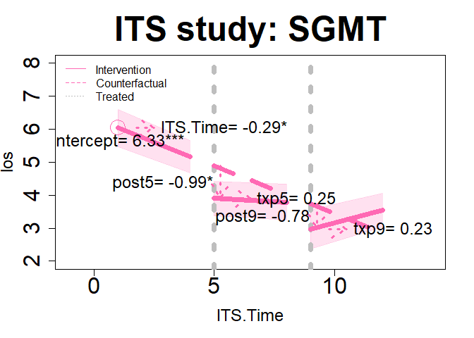 plot(im12, "ITS", add.legend="topleft", xlim=c(-1, 14), ylim=c(2, 8), main="ITS study: SGMT", col="hotpink", lwd=7, cex=3, cex.axis=2, cex.lab=1.5,  cex.main=3, arrow=TRUE, xshift=c(.25, .25), cex.text=1.5, coefs=TRUE, round.c=2, cfact=T, conf.int=TRUE, adj.alpha=0.2 )