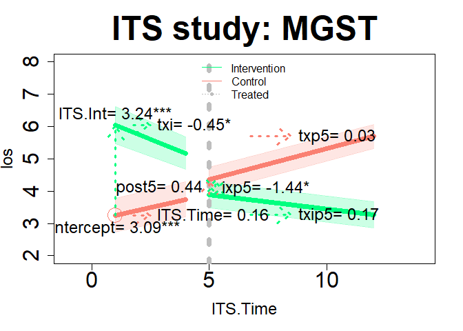plot(im21, "ITS", add.legend="top", xlim=c(-1, 14), ylim=c(2, 8), main="ITS study: MGST", col=c("springgreen","salmon"), lwd=7, cex=3, cex.axis=2, cex.lab=1.5,  cex.main=3, arrow=TRUE, xshift=c(.25, .25), cex.text=1.5, coefs=TRUE, round.c=2, pos.text= list("post5"=2), conf.int=TRUE, adj.alpha=0.2 )