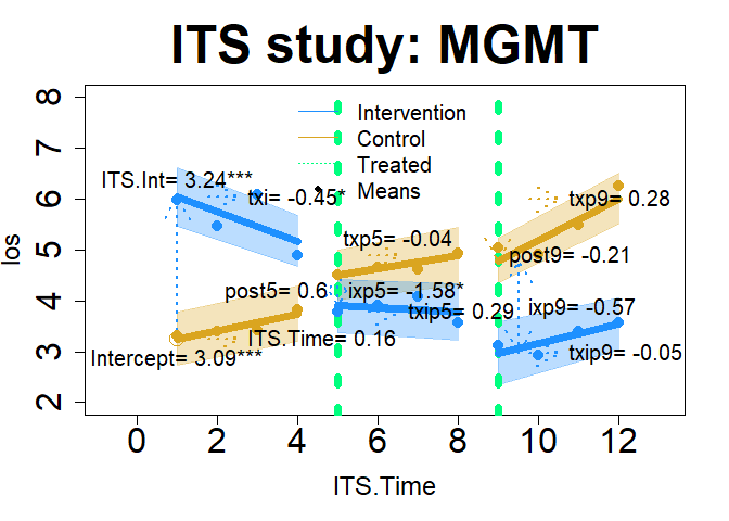 plot(im22, "ITS", add.legend="top", xlim=c(-.75, 13.1), ylim=c(2, 8), main="ITS study: MGMT", col=c("dodgerblue","goldenrod"), lwd=7, cex=2, cex.axis=2, cex.lab=1.5,  cex.main=3, cex.legend=1.25, arrow=TRUE, xshift=c(0, .5), cex.text=1.25, name=F, coefs=TRUE, round.c=2, pos.text= list("txp5"=3, "post9"=4), tcol="springgreen", cfact=T, conf.int=TRUE, adj.alpha=0.3, add.means=TRUE)
