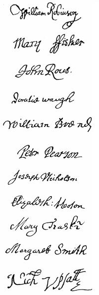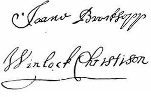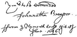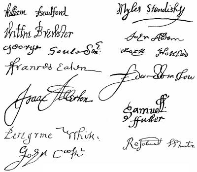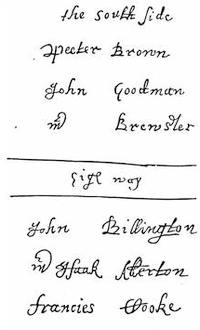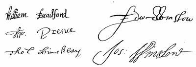 Autographs: John Smyth, 257; John Robinson, 259; Robert Browne, 261; Francis Johnson, 261; Signatures of Mayflower Pilgrims (William Bradford, Myles Standish, William Brewster, John Alden, John Howland, Edward Winslow, George Soule, Francis Eaton, Isaac Allerton, Samuel Fuller, Peregrine White, Resolved White, John Cooke), 268; Dorothy May, 268; William Bradford, 268; Thomas Cushman, 271; Alexander Standish, 273; James Cole, senior, 273; Signers of the Patent,1621 (Hamilton, Lenox, Warwick, Sheffield, Ferdinando Gorges), 275; Governors of Plymouth Colony (William Bradford, Edward Winslow, Thomas Prence, Thomas Hinckley, Josiah Winslow), 278.