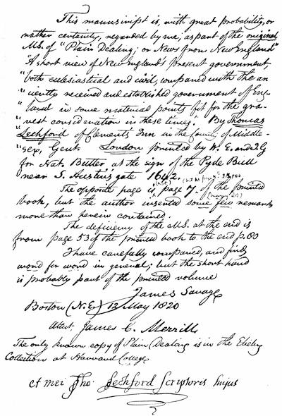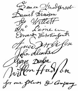 Autographs[x]: William Blaxton, 311; Samuel Maverick, 311; Thomas Walford, 311; Mathew Cradock, 312; John Wilson, 313; Quaker autographs, 314; John Endicott, 317; Colonial ministers of 1690 (Charles Morton, James Allen, Michael Wigglesworth, Joshua Moody, Samuel Willard, Cotton Mather, Nehemiah Walter), 319; Joseph Dudley, 320; Abraham Shurt, 321; Thomas Danforth, 326; Thomas Hooker, 330; John Haynes, 331; John Winthrop, the younger, 331; John Allyn, 335; William Coddington, 336; Samuel Gorton, 336; Narragansett proprietors (Simon Bradstreet, Daniel Denison, Thomas Willett, Jno. Paine, Edward Hutchinson, Amos Richison, John Alcocke, George Denison, William Hudson), 338; Roger Williams, 339.