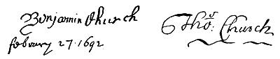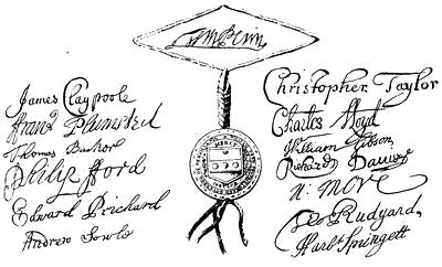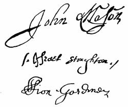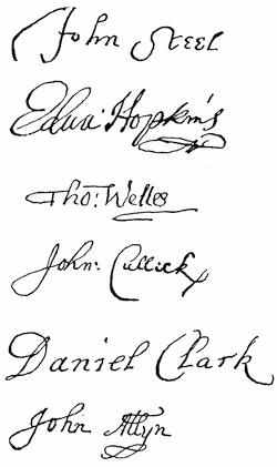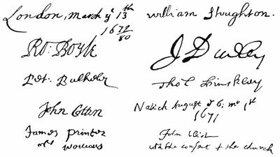 Autographs: Leaders in Pequot war (John Mason, Israel Stoughton, Lion Gardiner), 348; Jonathan Brewster, 349; Nathaniel Ward, 350; Signatures connected with the Indian Bible (Robert Boyle, Peter Bulkley, William Stoughton, Joseph Dudley, Thomas Hinckley, John Cotton, John Eliot, James Printer), 356; Edward Johnson, 358; John Norton, 358; Edward Burrough, 359; Robert Pike, 359; Benjamin Church, 361; Thomas Church, 361; William Hubbard, 362; Walter Neale, 363; Ferdinando Gorges, 364; John Mason, 364; Roger Goode, 364; Thomas Gorges, 364; Connecticut secretaries (John Steel, Edward Hopkins, Thomas Welles, John Cullick, Daniel Clark, John Allyn), 374.