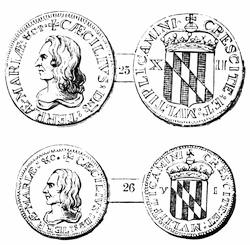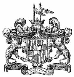 The first great seal of the Province was lost during Ingle’s Rebellion; and in 1648 the Proprietary sent out another seal, slightly different. This seal had engraven on one side the figure of the Proprietary in armor on horseback, with drawn sword and a helmet with a great plume of feathers, the trappings being adorned with the family arms. The inscription round about this side was: Cecilius absolutus dominus Terra Mariæ et Avaloniæ Baro de Baltimore. On the other side of the seal was engraven a scutcheon with the family arms; namely, six pieces impaled with a band dexter counterchanged, quartered with a cross bottony, and counterchanged; the whole scutcheon being supported with a fisherman on one side and a ploughman on the other (in the place of the family leopards), standing upon a scroll, whereon the Baltimore motto was inscribed; namely, Fatti maschii, parole femine. Above the scutcheon was a count-palatine’s cap, and over that a helmet, with the crest of the family arms; namely, a ducal crown with two half bannerets set upright. Behind the scutcheon and supporters was engraven a large ermine mantle, and the inscription about this side of the seal was, Scuto bonæ voluntatis tuæ coronasti nos. In 1657 Lord Baltimore sent out another seal, similar in design, which was used till 1705. Subsequent changes were made in the seal and arms of the Province and State, but in 1876 the last described side of the Great Seal sent out in 1648 was adopted as the arms of Maryland. A full account of the pedigree of the Calverts will be found in An Appeal to the citizens of Maryland, from the legitimate descendants of the Baltimore family, by Charles Browning, Baltimore, 1821. [Fuller’s Worthies of England and Anthony Wood’s Athenæ Oxoniensis give us important facts regarding the first Lord Baltimore. See John G. Morris’s The Lords Baltimore, 1874, No. 8 of the Fund Publications of the Historical Society; and Neill’s English Colonization in North America, ch. xi.—Ed.]