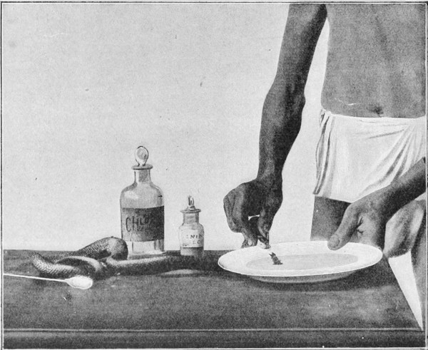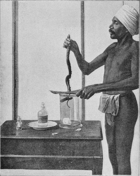 In the month of October, 1891, during the rains, a village in the vicinity of Bac-Lieu, in Lower Cochin-China, was invaded by a swarm of poisonous snakes belonging to the species known as Naja tripudians, or Cobra-di-Capello. These creatures, which were forced by the deluge to enter the native huts, bit four persons, who succumbed in a few hours. An Annamese, a professional snake-charmer in the district, succeeded in catching nineteen of these cobras and shutting them up alive in a barrel. M. Séville, the administrator of the district, thereupon conceived the idea of forwarding the snakes to the newly established Pasteur Institute at Saigon, to which I had been appointed as director.